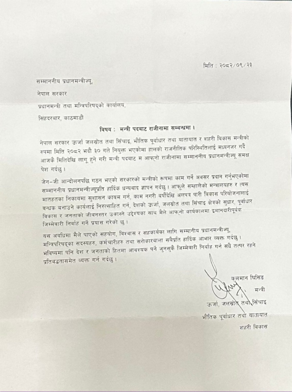 काठमाडौं पुस । कुलमान घिसिङले प्रधानमन्त्री सुशीला कार्कीलाई राजीनामा बुझाएका छन् । बुधबार राति प्रधानमन्त्री निवास बालुवाटार पुगेर ऊर्जामन्त्री घिसिङले प्रधानमन्त्री कार्कीसमक्ष राजीनामा पत्र बुझाएका हुन् ।